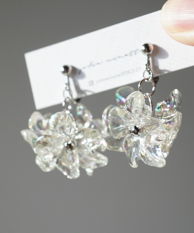 【素材】 サージカルステンレス ボール スタッド 、フック ピアス ニッケルフリー ねじ式イヤリング (痛み軽減用シリコンゴム付き) ※取り外し可能 金属アレルギー対応素材 その他、メッキ加工金属、アクリルビーズ 【サイズ】 クリア ドロップ 花 size: 全体の長さ:約3.5cm 重さ:片耳 約5g 【アクセサリーのポイント】 かわいいデザインの花がぎゅっと集まって 透明感のあるビーズが花の下から見えるアイテムです。 _____________________ ※アレルギーの原因はさまざまです。 アレルギーが起きにくい素材ではありますが、 すべての方にアレルギーが起きないことを お約束するものでありません。 アレルギー反応が出た場合は、ご使用をお控えくださいませ。 ※商品画像のアクセサリーはサンプル品にて撮影しております。 ※サンプルでの採寸のためあくまで目安となります。予めご了承ください。 ※撮影時の自然光の強さ、明るさ、PCやスマートフォンの環境により写真の色味が実際の商品と異なって見える場合がございます。ご了承の上お買い求め下さいませ。 【お手入れ方法】 ご使用後の皮脂汚れなどや、水に濡れた場合は、柔らかい布などでふき取っていただくことを推奨しております。 【保管方法】 ご使用になられない場合は、直射日光や、紫外線を避けた場所での保管を推奨しております。 さらに、チャック付きの袋などに入れることでより、アクセサリーを綺麗に保つことができます。