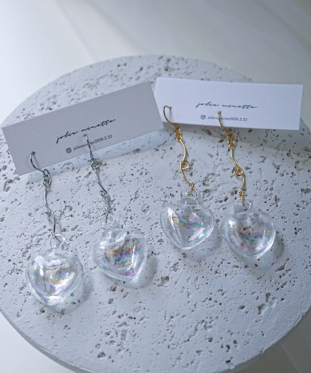 【素材】 サージカルステンレス ボール スタッド、フック ピアス ネジ式ニッケルフリーイヤリング(取り外し可能、シリコンゴム付き) 金属アレルギー対応素材 オーロラ加工 水入りハート型ガラスドーム 【サイズ】 重さ:片耳 約3g 全体的な長さ:約6cm ハート型ガラスサイズ:約横2cm×縦2.5cm 【アクセサリーのポイント】 ガラスで作られたハートの中には、 お水が入っており、見ていても楽しいデザインです。 ガラスにはオーロラ加工がされており、美しい商品です。 くるっとしたコネクターがハートと合わさり 可愛らしさがあるデザインに仕上げました。 【お取り扱い注意】 ガラス素材を使用した商品です。 強い力が加わることで 破損する恐れがございますので お取り扱いにはご注意くださいませ。 【お水入りガラスについて】 ひとつひとつ手作りされたパーツのため、 中に入っているお水の量には、 半分より多いもの、半分より少ないものもございます。 また、ガラスの形、オーロラ加工も手作りのため 多少の誤差があることをご了承いただけますと幸いです。 _____________________ ※アレルギーの原因はさまざまです。 アレルギーが起きにくい素材ではありますが、 すべての方にアレルギーが起きないことを お約束するものでありません。 アレルギー反応が出た場合は、ご使用をお控えくださいませ。 ※商品画像のアクセサリーはサンプル品にて撮影しております。 ※サンプルでの採寸のためあくまで目安となります。予めご了承ください。 ※撮影時の自然光の強さ、明るさ、PCやスマートフォンの環境により写真の色味が実際の商品と異なって見える場合がございます。ご了承の上お買い求め下さいませ。 【お手入れ方法】 ご使用後の皮脂汚れなどや、水に濡れた場合は、柔らかい布などでふき取っていただくことを推奨しております。 【保管方法】 ご使用になられない場合は、直射日光や、紫外線を避けた場所での保管を推奨しております。 さらに、チャック付きの袋などに入れることでより、ジュエリーを綺麗に保つことができます。
