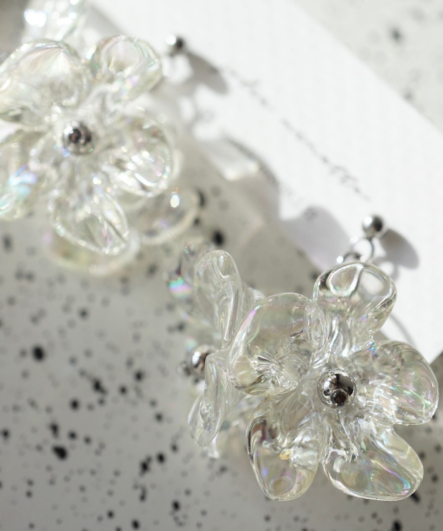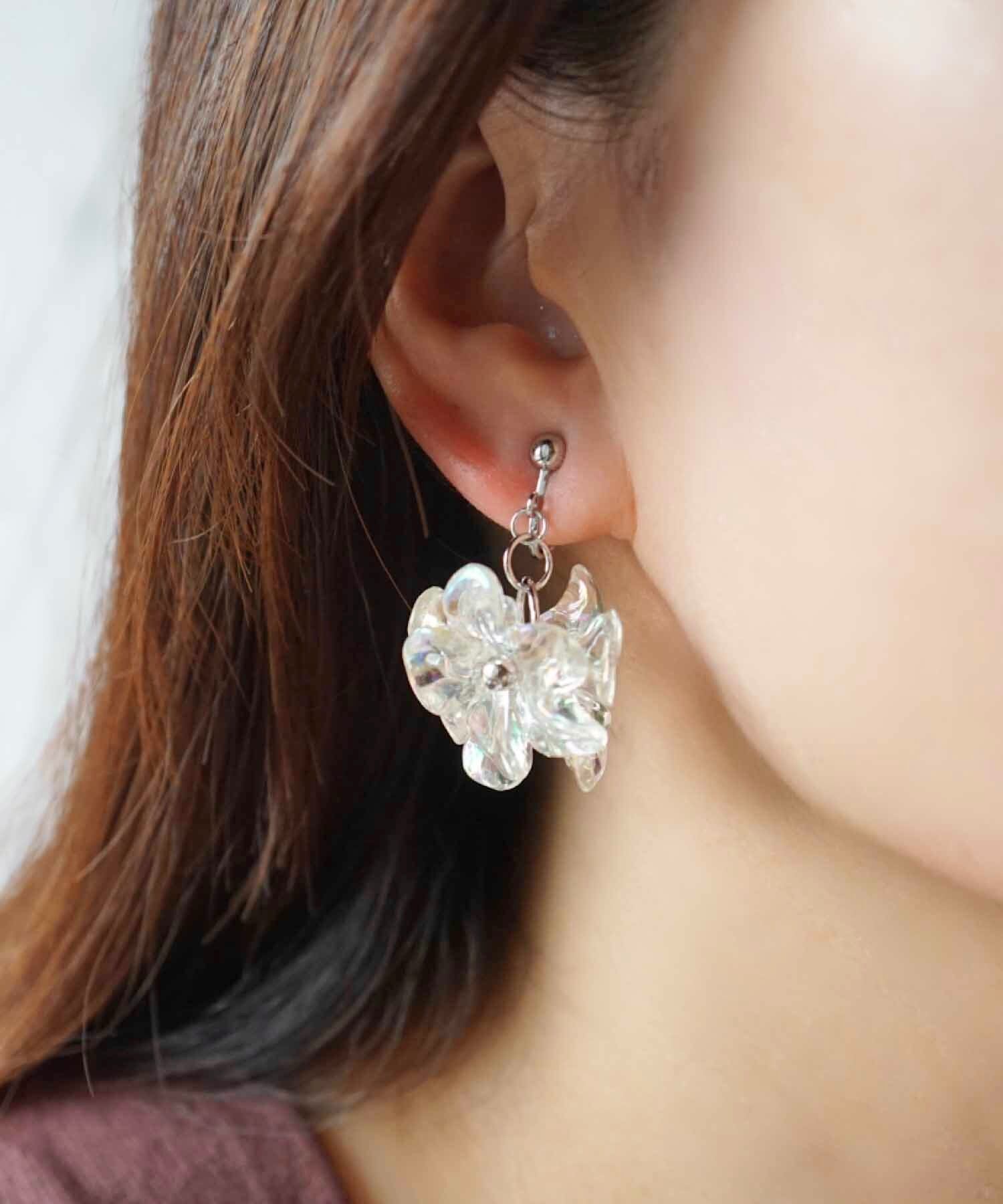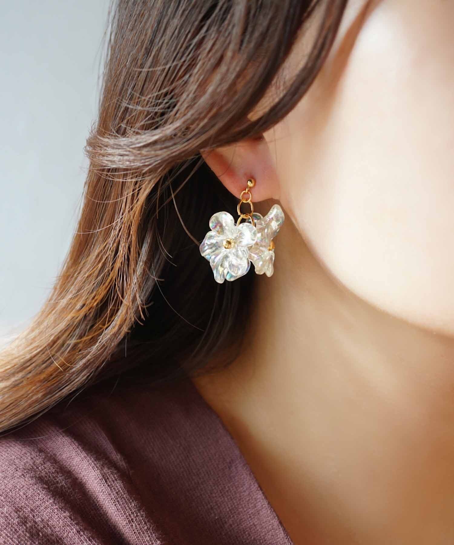耳元に揺れるお花がコーディネートを華やかに彩ります。