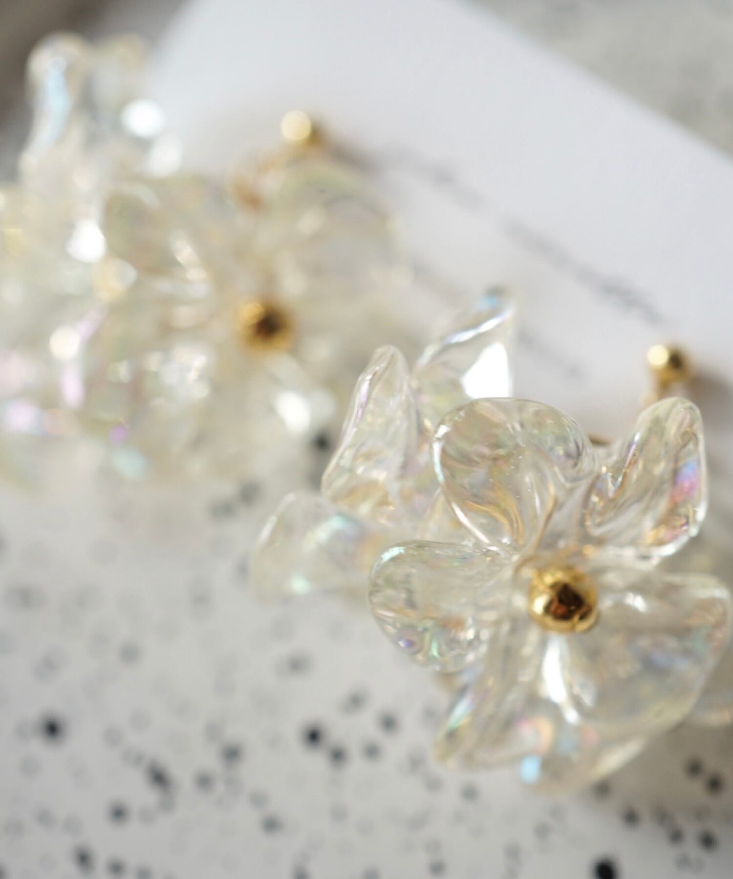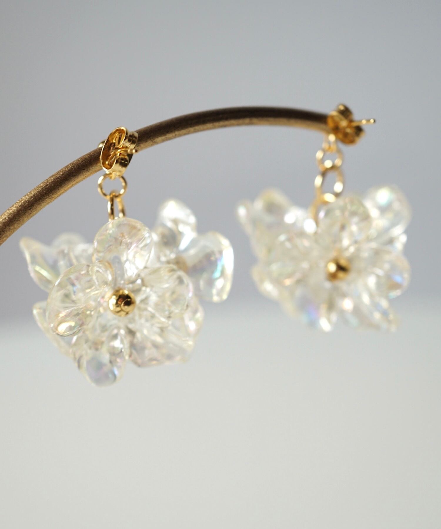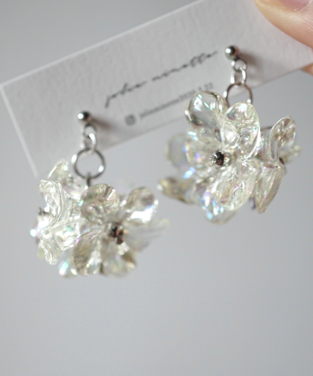 耳元に揺れるお花がコーディネートを華やかに彩ります。