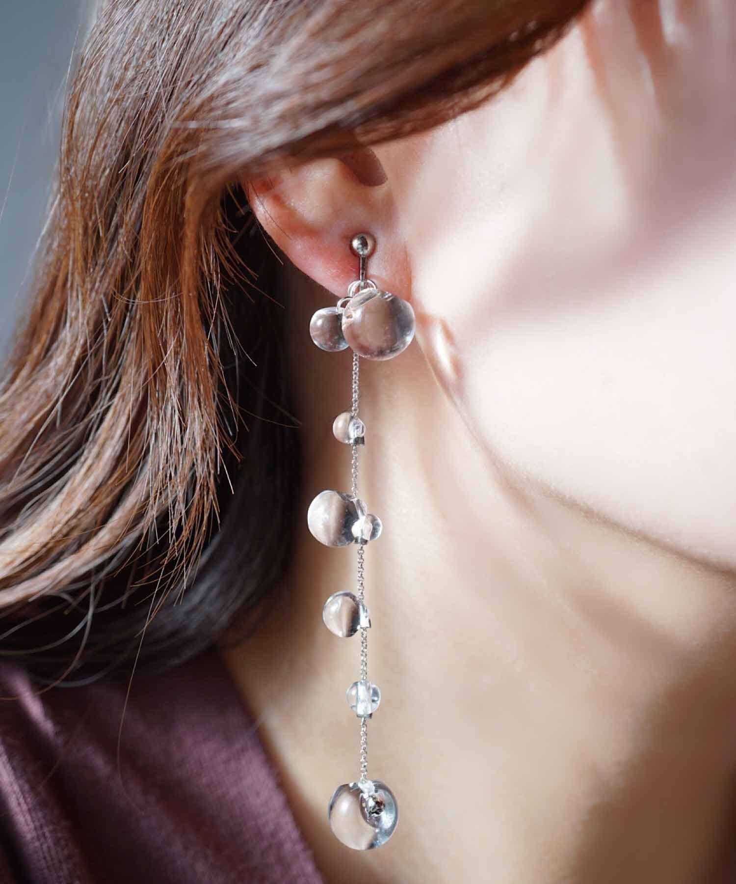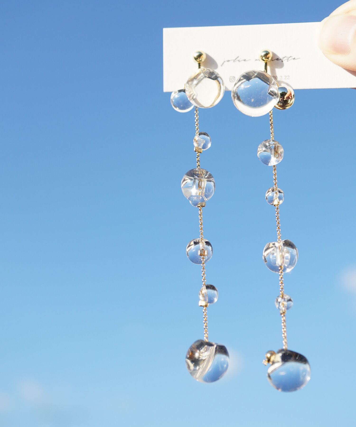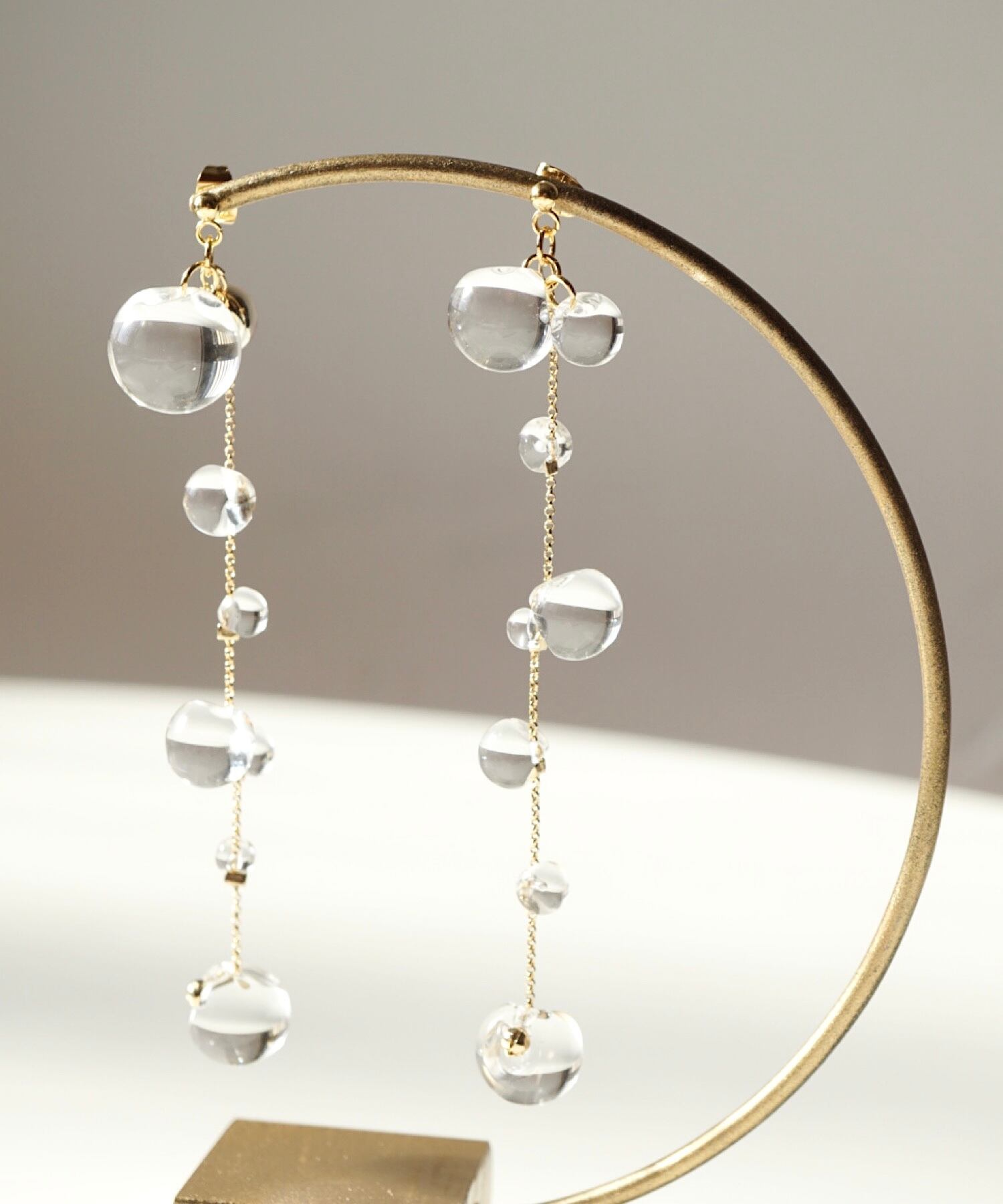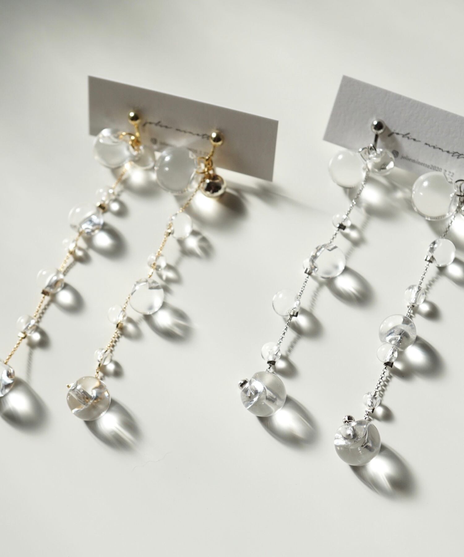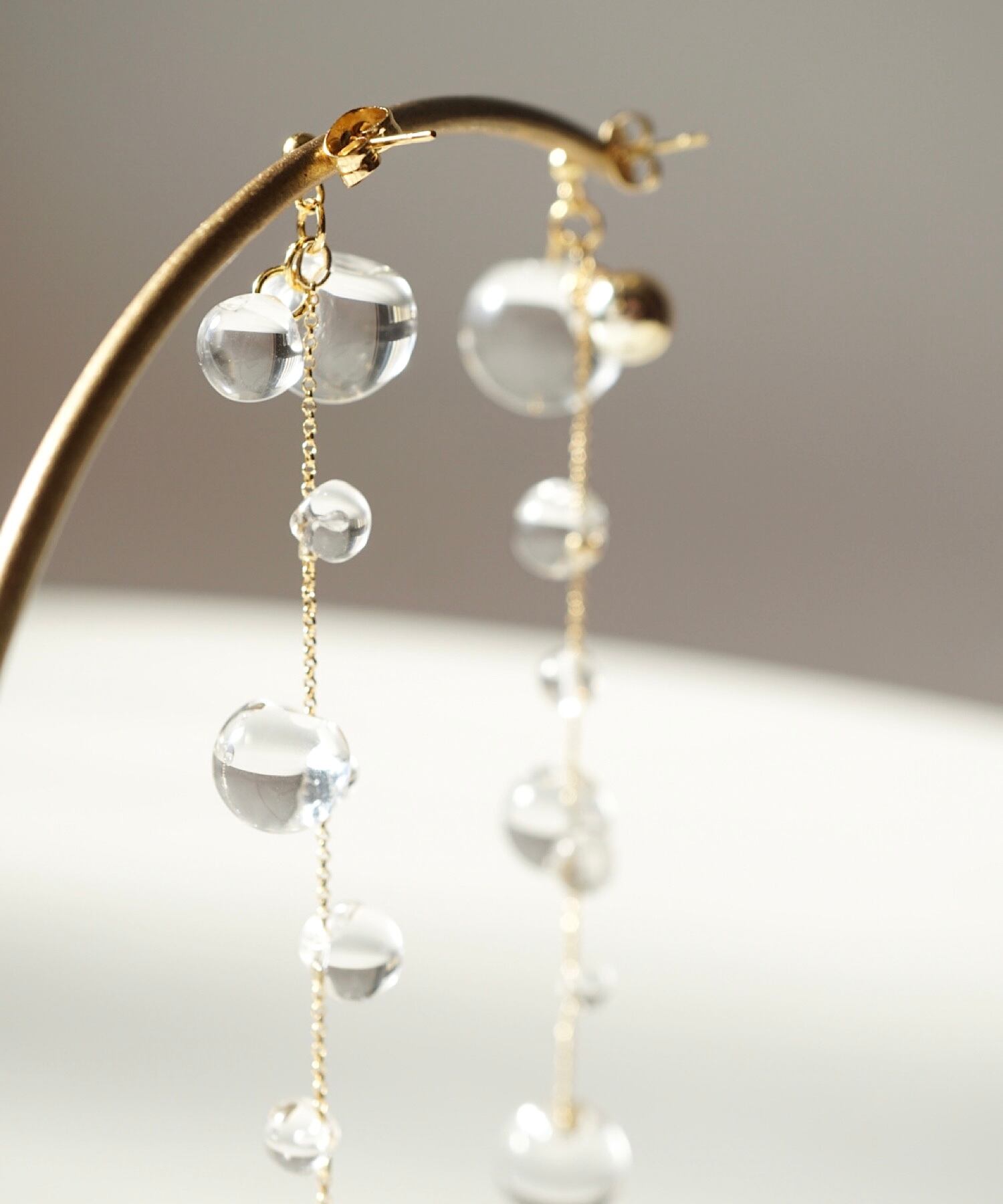 透明感のあるクリアビーズが、耳元でゆらゆらと揺れる水滴アクセサリー。